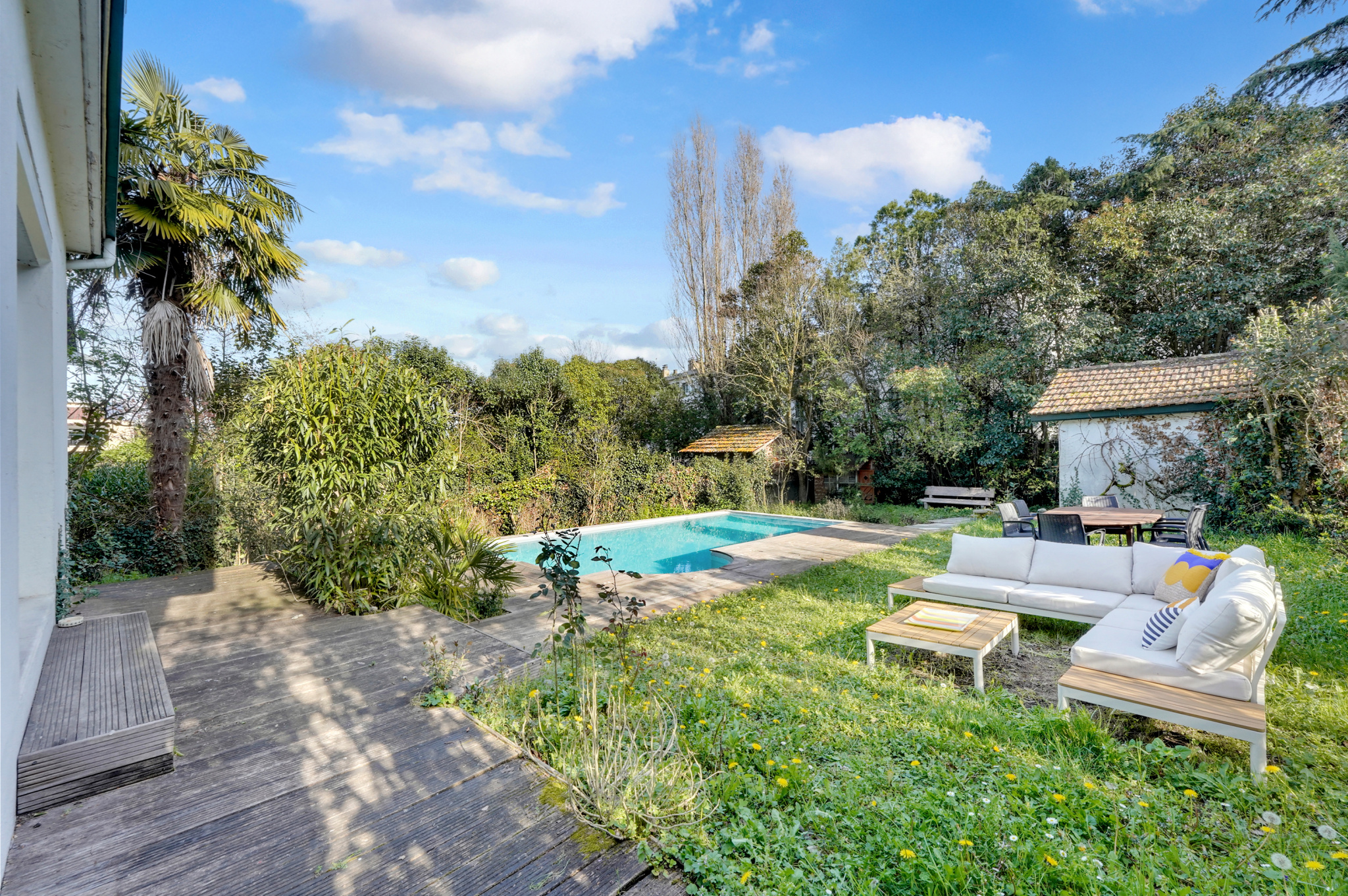 Sur l'arrière, un beau jardin arboré avec piscine au sel et abri de jardin.